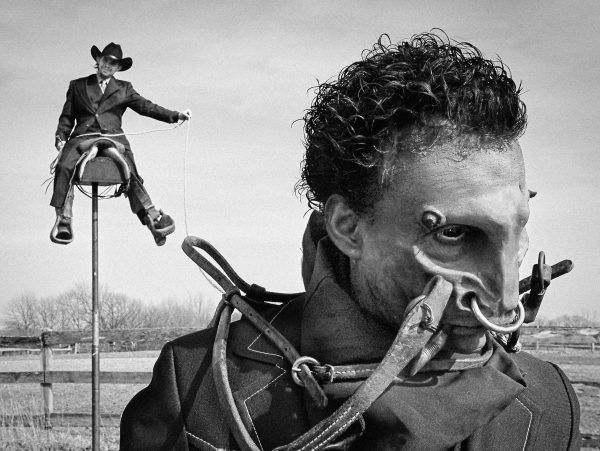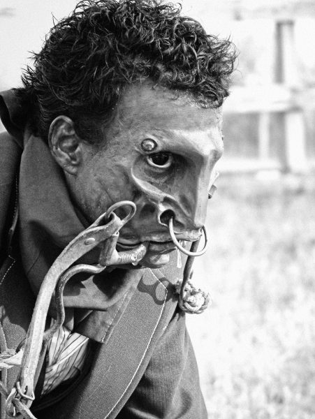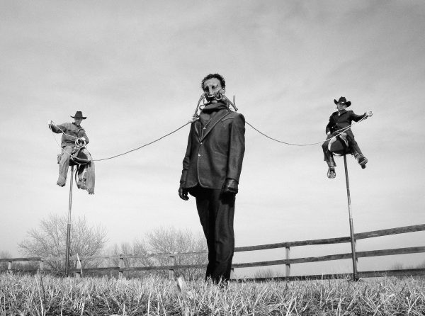 March 2003. Photo documentation of a series of performances on a ranch outside of Omaha, NE. During their residency at the Bemis Center, the artists manufactured multiple custom facial prosthetics for various performances in and around Omaha.
