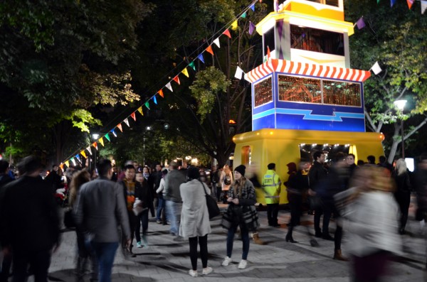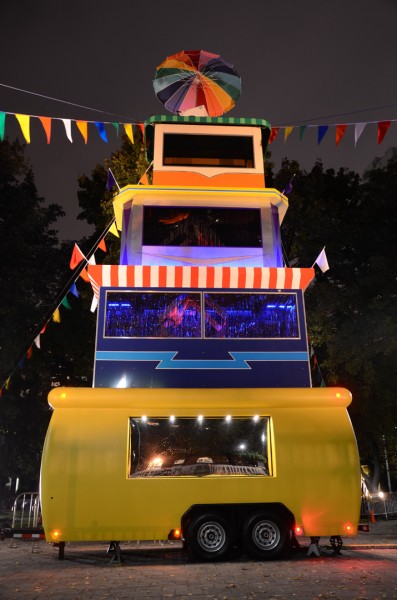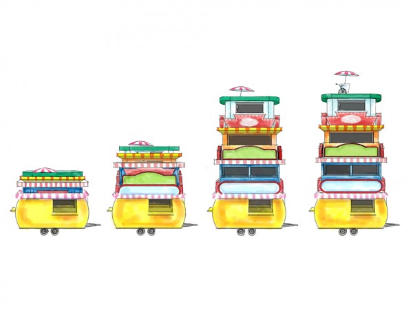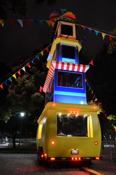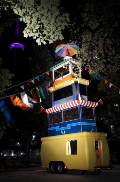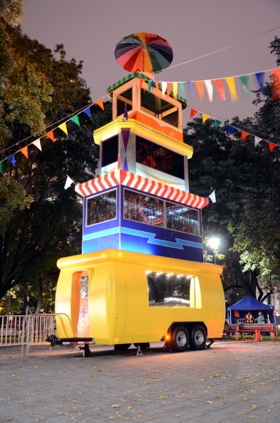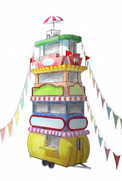 The vast bright and colourful structures of a festival or circus are surrounded by dazzling sounds, sights and smells. Ubiquitous concession stands and mobile exhibits make up much of the landscape. Vying for attention amongst the crowds, these transitory structures rely on brilliant lighting, color and height to stand out.