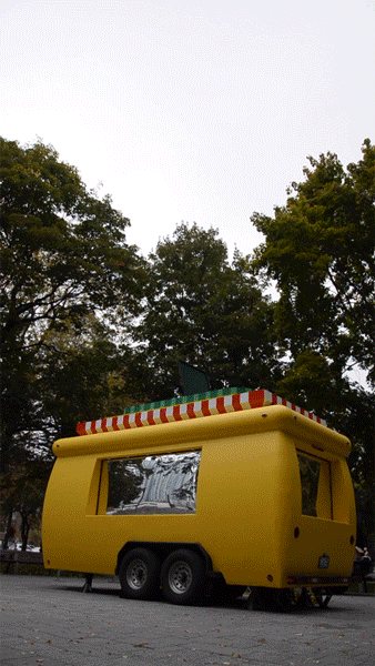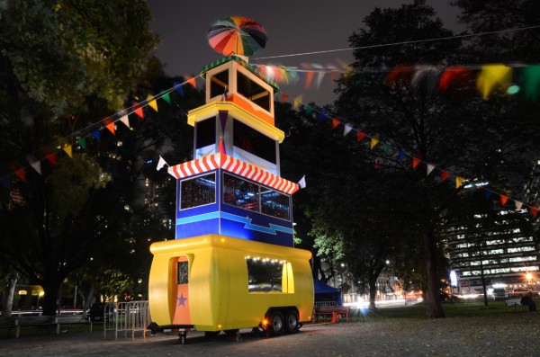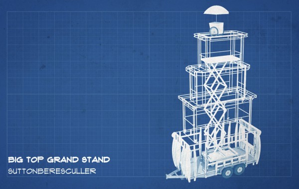In response to transitory environments common to fairs, festivals and circuses, SuttonBeresCuller have created a large migratory outdoor sculpture. This monument comments upon the aesthetics of its environment. Atop a 16′ flatbed trailer, four unique structures neatly nested within each other telescope skyward, extending into a baroque sculpture. Adorned with flashing lights, vibrant flags and reflective surfaces, this flamboyant homage has turned the concession stand into pure sculptural form.