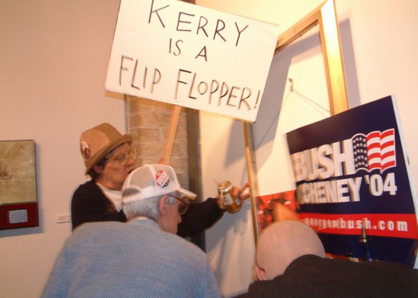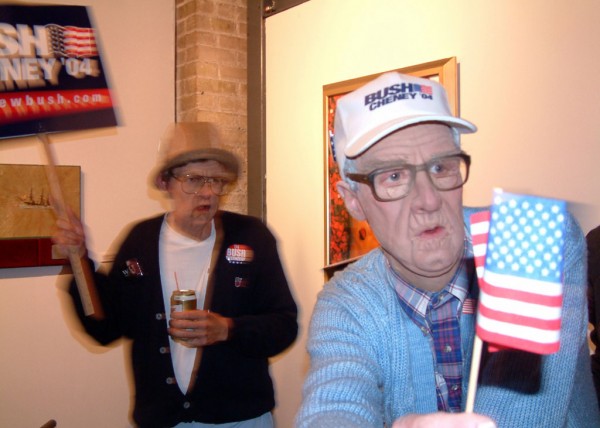 Posing as aged Bush supporters, the artists destroy a scandalous work of art for Vital 5’s 101 Ways to Remove A President From Power.