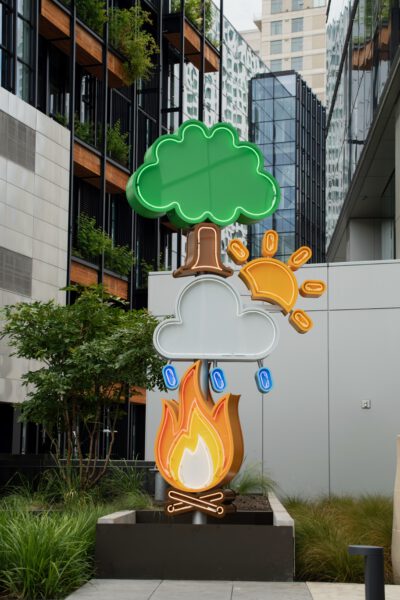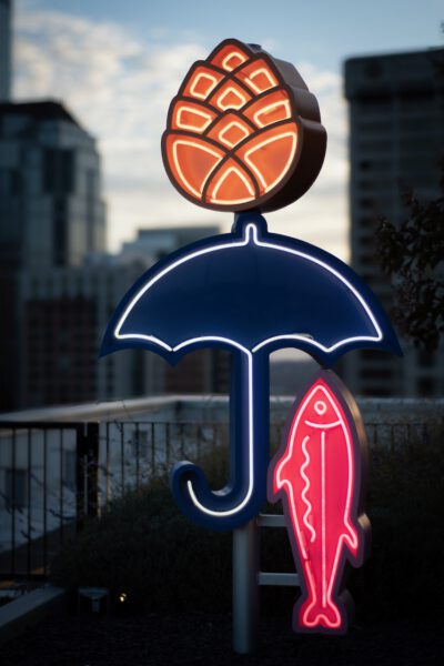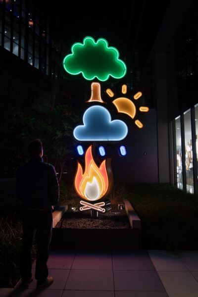 Each piece becomes a bright beacon, its neon light adding warmth and approachability. The iconic forms are instantly recognizable, yet their oddball pairings spark curiosity and amusement. This tension between the familiar and the nonsensical offers a lighthearted break from routine, inviting people to reflect on the unexpected wonders of everyday life and our ever-changing environment. By reordering these symbols, we celebrate our region’s unique relationship with nature—an adventurous connection that thrives on reinterpretation.