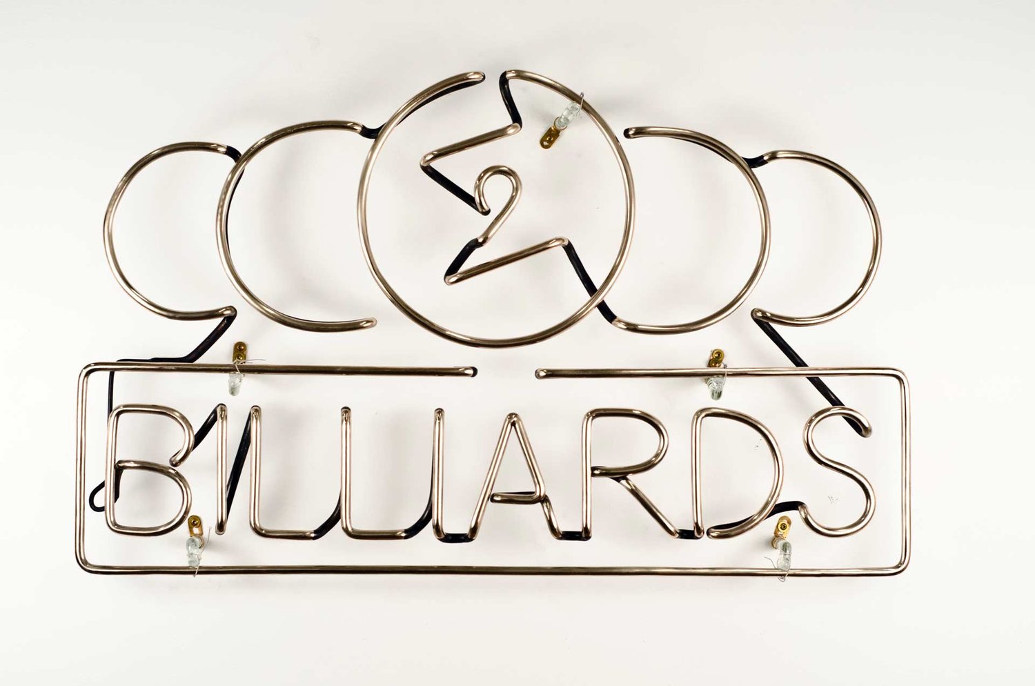 Billiards, 2014. Bronze with patina and hand polishing, glass neon tube supports. 19 x 31 x 1.5 inches. Unique.