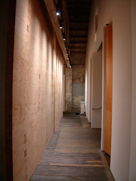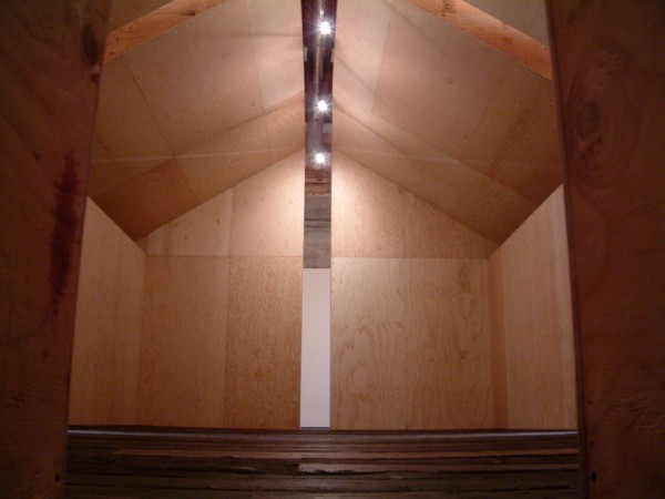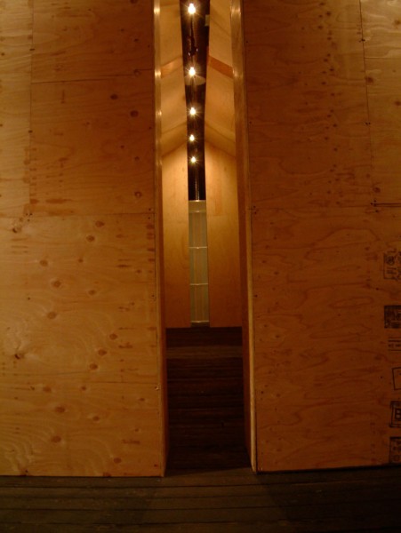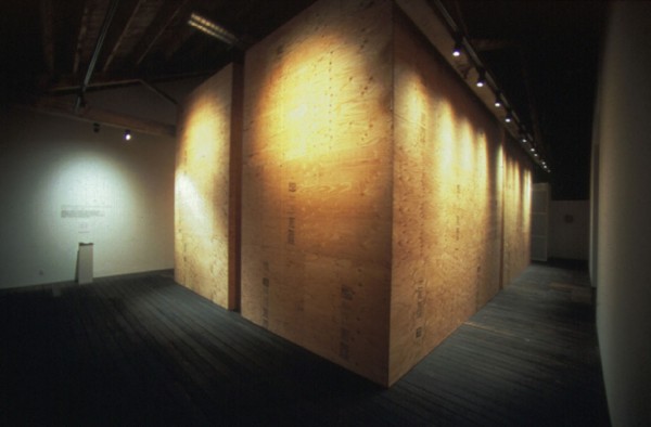 Installation constructed for Suyama Space. The structure took the form of a plywood cube extending up to the ceiling, divided into quadrants by four narrow vertical slits that led the viewer into the interior. Once inside, the form of an imagined house, or rather, the void left by the house becomes apparent. The interior is intended to imply the living space and social interaction of a basic single family home, referencing the manufactured house, urban sprawl, and the homogenization of culture as it metaphorically examined the physical and less tangible aspects of what makes a home.