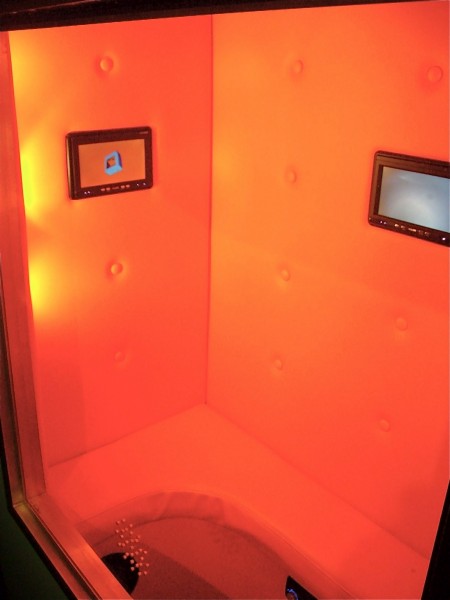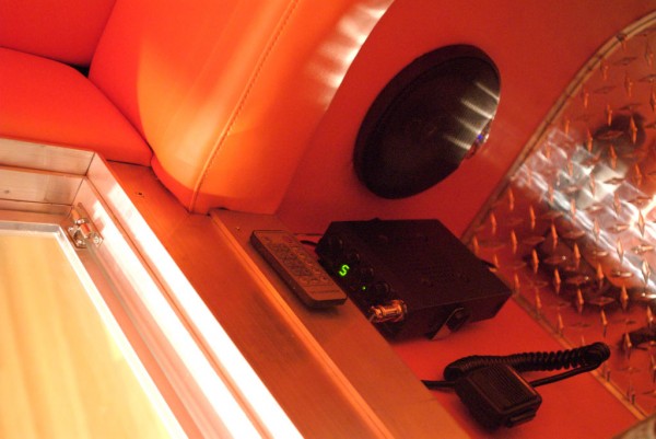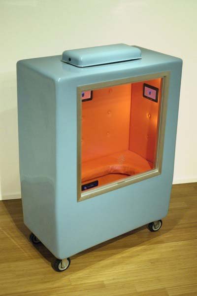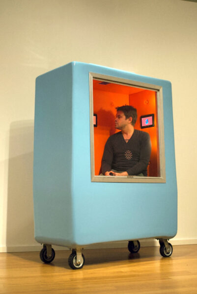 A self-contained, mobile micro-stage designed for individual use, pPod invites the viewer to step inside and become both performer and subject. Outfitted with a CB radio, DVD player, speakers, and security cameras.
