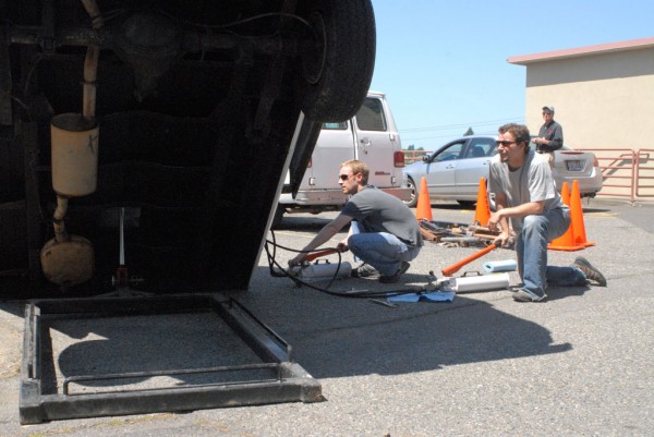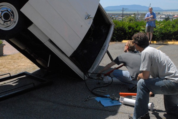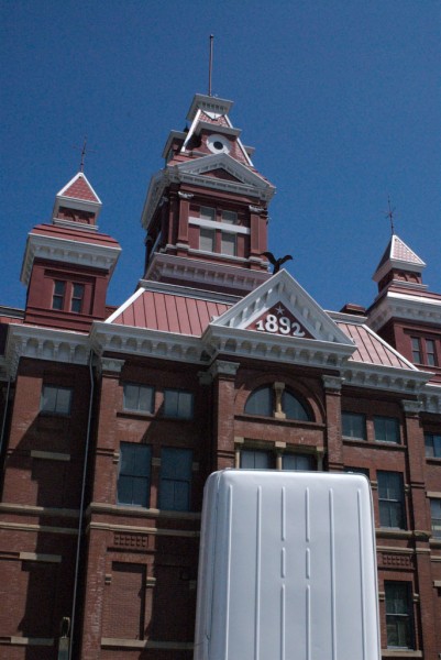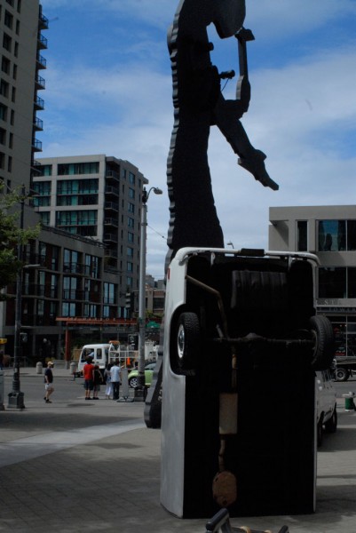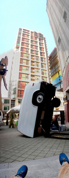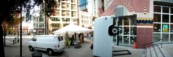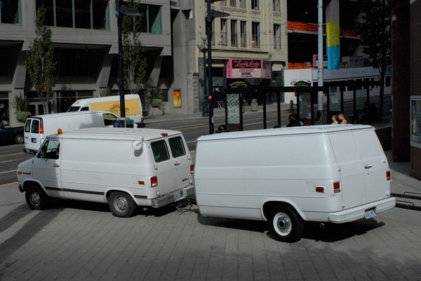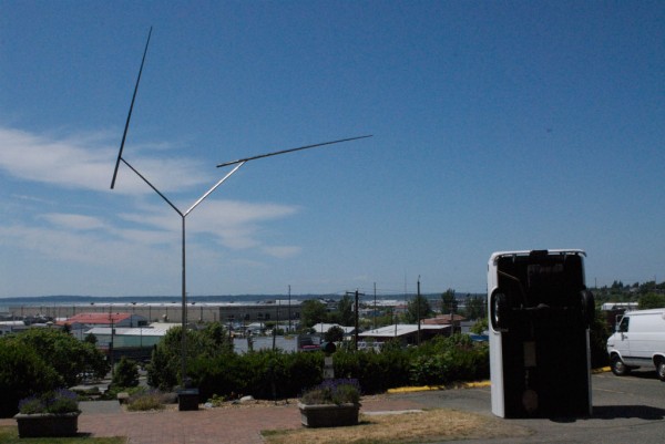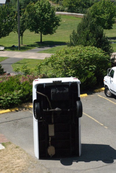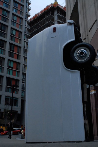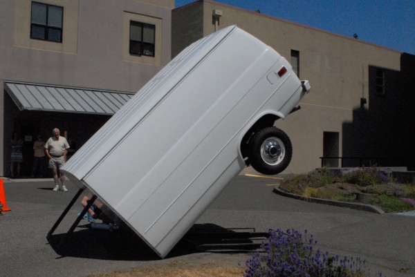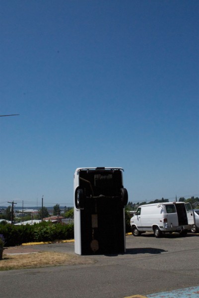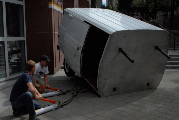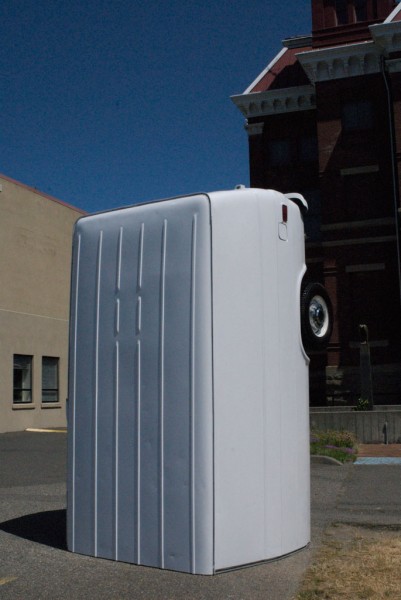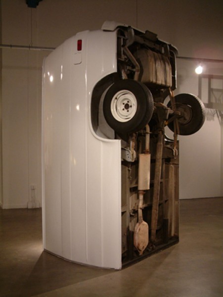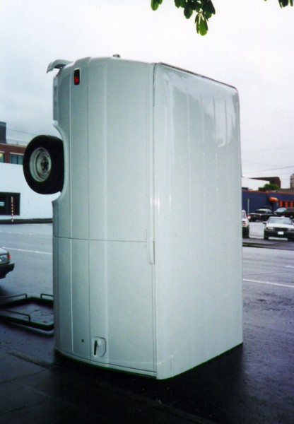 One half of a cargo van is modified with a hydraulic lift system that allows it to tilt upright, reorienting the vehicle into a vertical, monolithic form. Familiar as a utilitarian object yet rendered uncanny in its new position, the sculpture shifts perception through a simple but dramatic change in orientation.