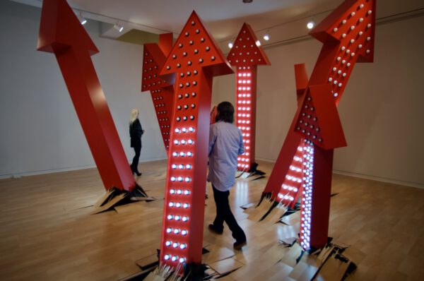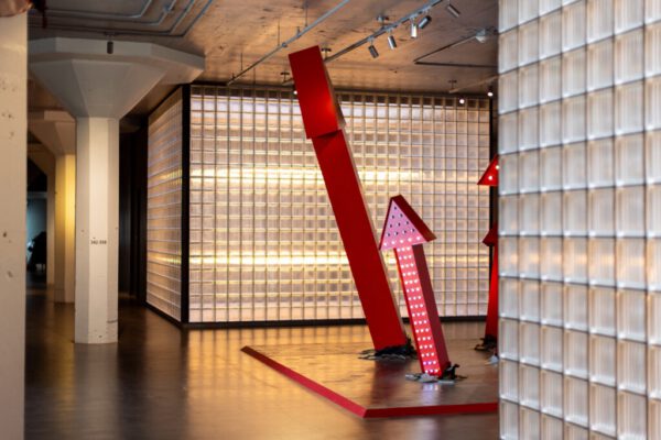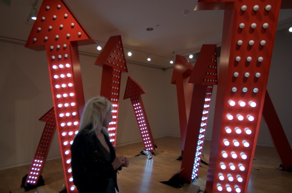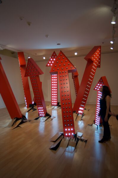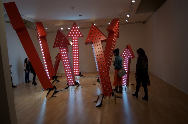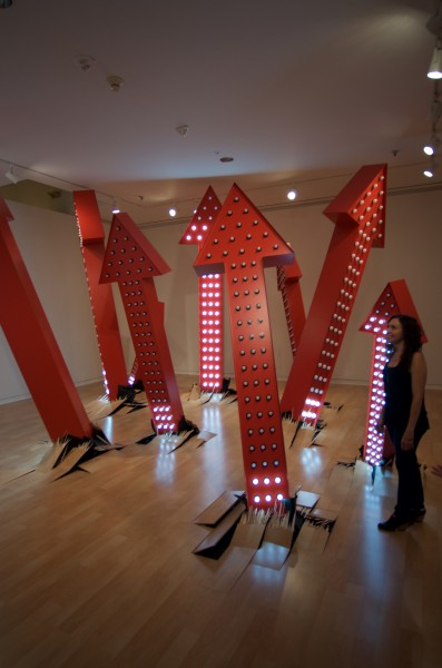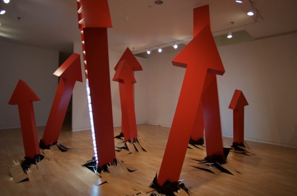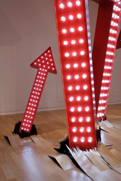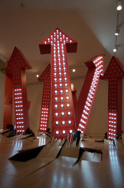 You Always Leave Me Wanting More addresses the sustainability of growth as it pertains to aspects of our social, economic and natural environments. We have co-opted the stripped down language of commercial signs, incorporating casino style way-finders that tear through the floors of the museum with skyward trajectory.