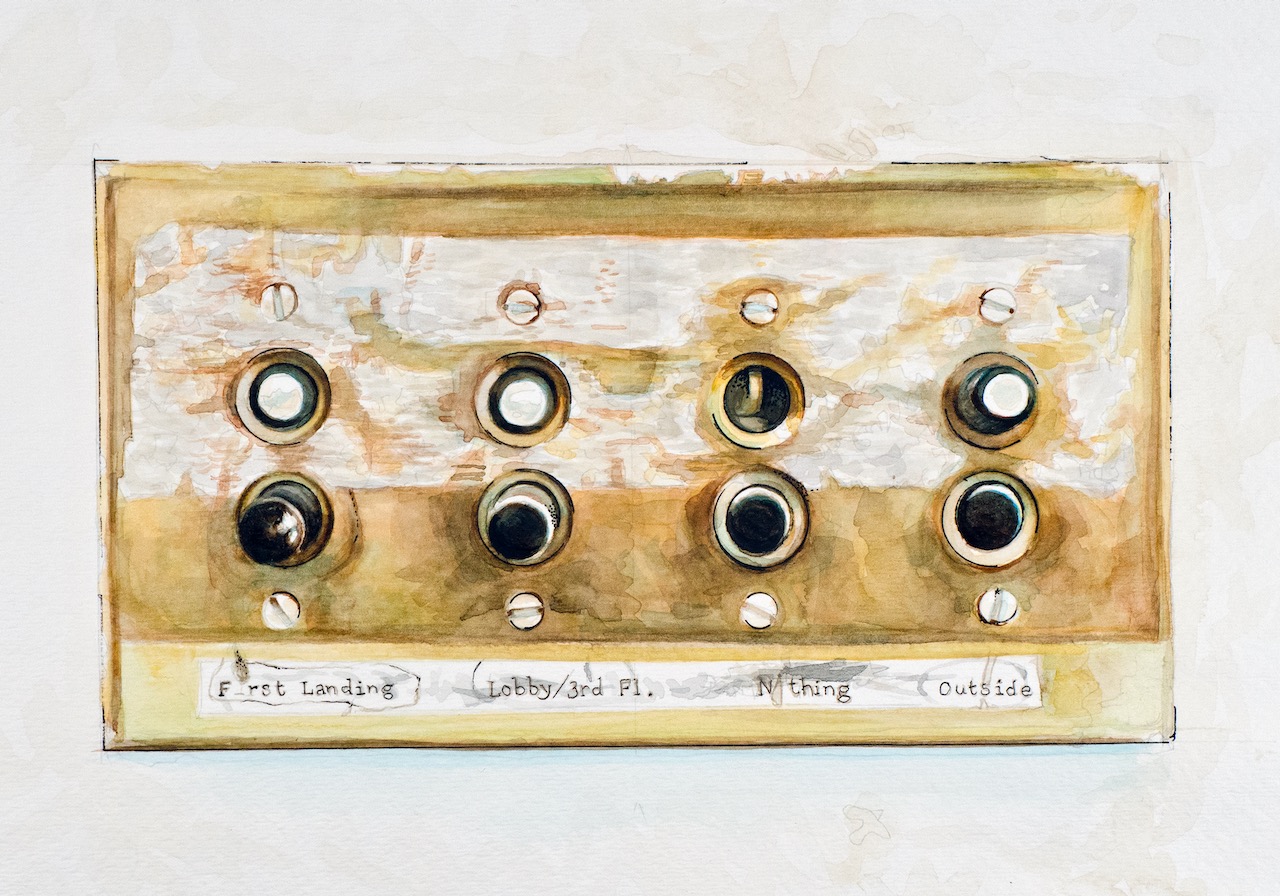 Stevens Housing Co-op Lobby, 2015. Watercolor, ink on paper.
